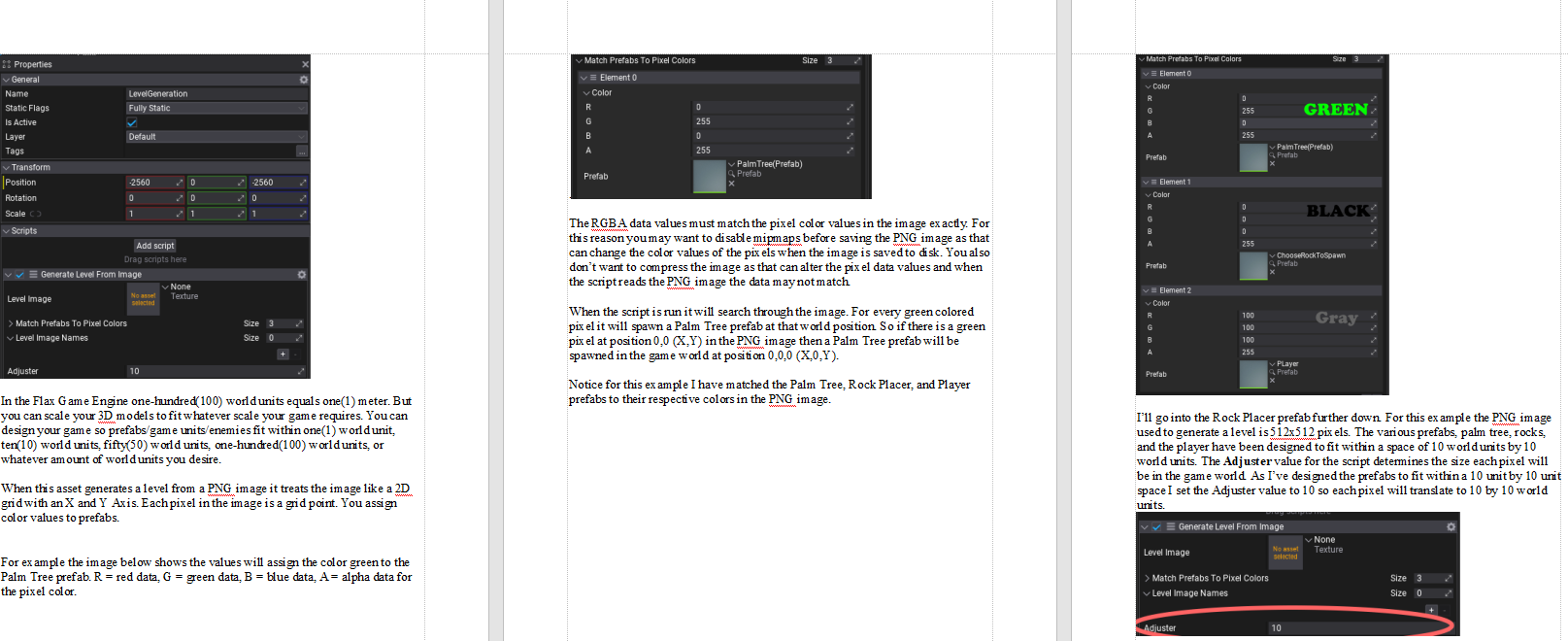 When this asset generates a level from a PNG image it treats the image like a 2D grid with an X and Y axis. Each pixel in the image is a grid point. You assign color values to prefabs. When the image is read by the game if a pixel color matches the color assigned to a prefab the pixel coordinate in the image is translated to game world coordinates and the assigned prefab is spawned at the appropriate location. This asset also allows you to set the size, in game world units, of each pixel. So each grid point/pixel of the image can be set to 1 world unit in size to 100 world units in size, or more.