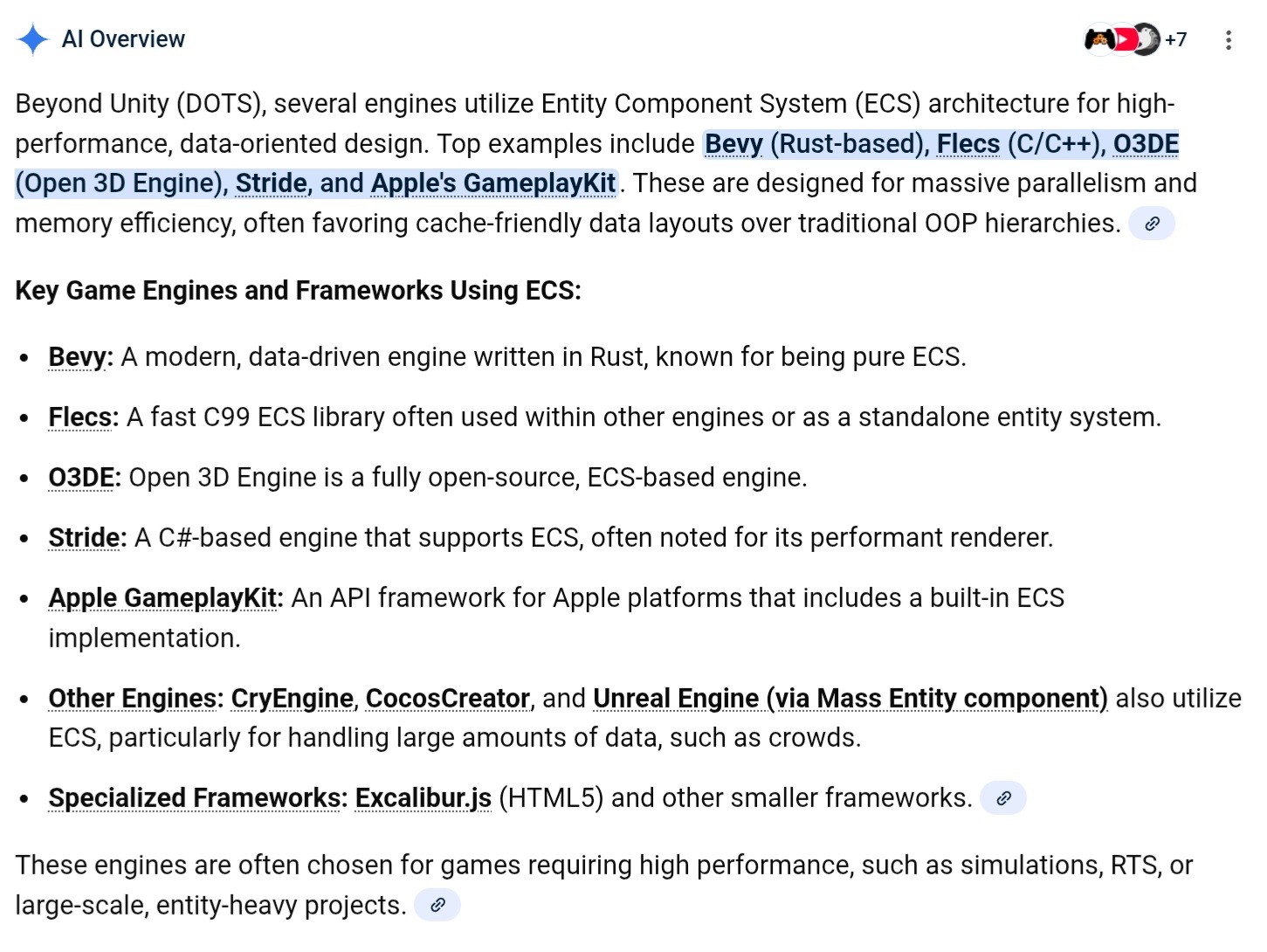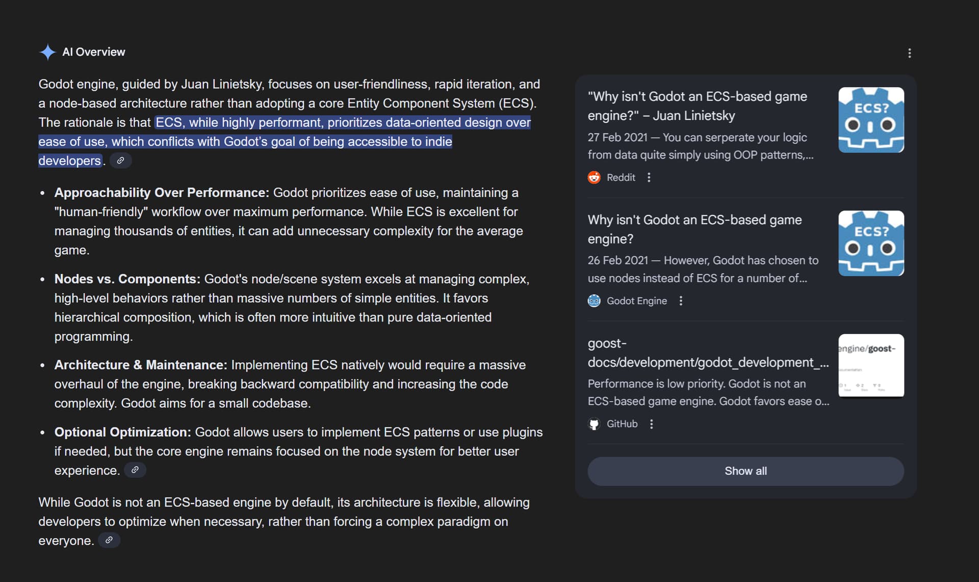 at the Godot Engine it was also decided not to add ECS logics because it was somehow less user - friendly, and that Juan Linietsky that’s sort of in charge of the engine decided it was better to focus on other things, or that there’s a link to an article where he explains their decisisons at the FOSS software