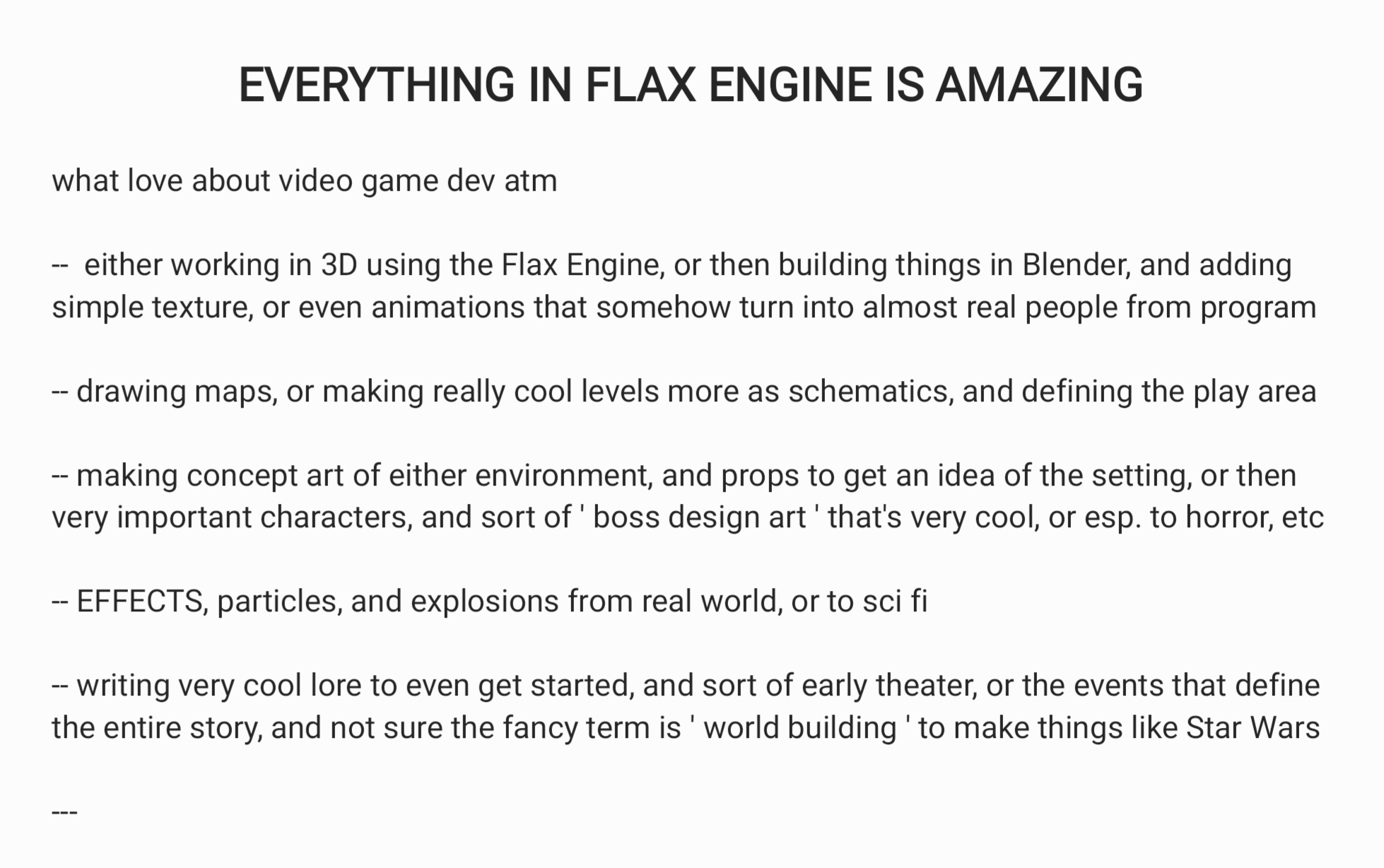 it sounds like they have a really good idea, or wish them as much succes as they deserve, and however got to thinking what’s really good about these video games, or what perhaps could be really nice in Flax Engine